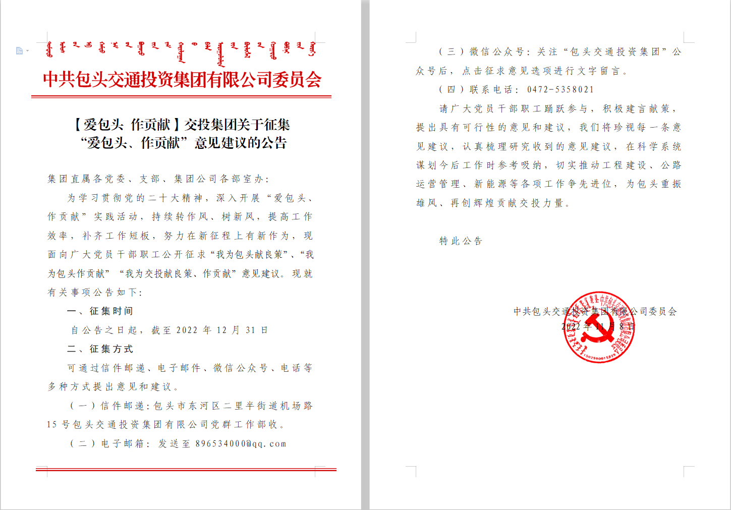 【爱包头 作贡献】交投集团关于征集“爱包头、作贡献”意见建议的公告