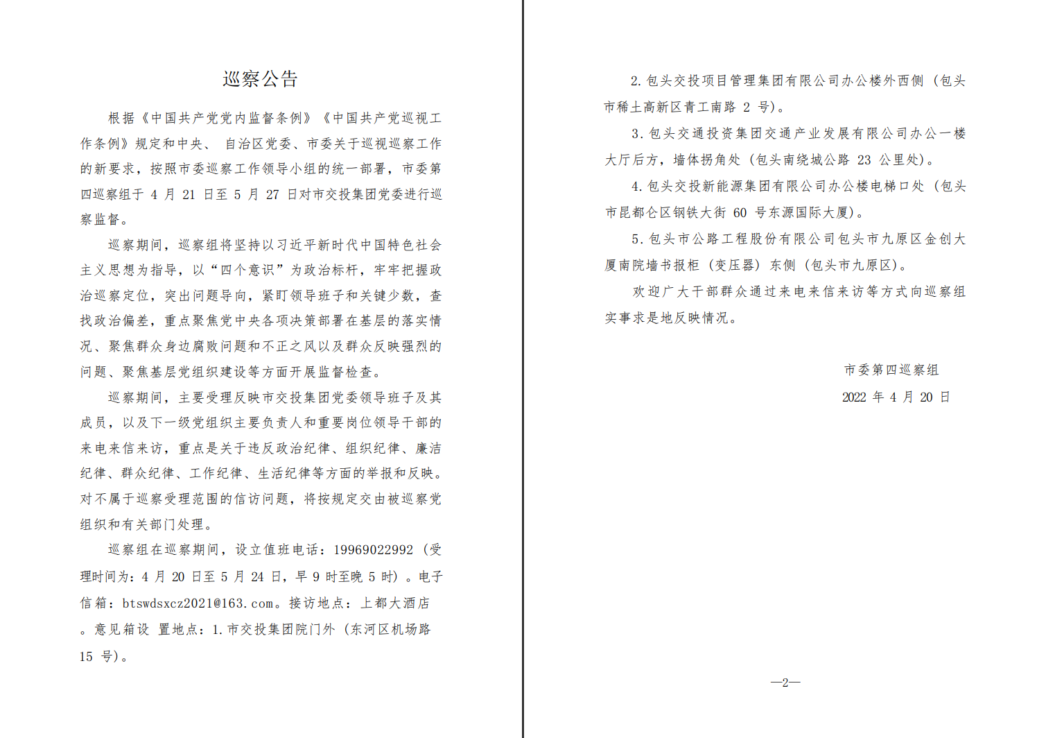 按照市委统一部署,2022年4月20日至5月31日,市委第四巡察组对市交投集团党委进行了常规巡察。9月2日,市委第四巡察组向交投集团党委反馈了巡察意见。根据《中共包头市委巡察整改工作实施办法》(包党办发〔2022〕49号)规定,现将巡察整改进展情况予以公布。