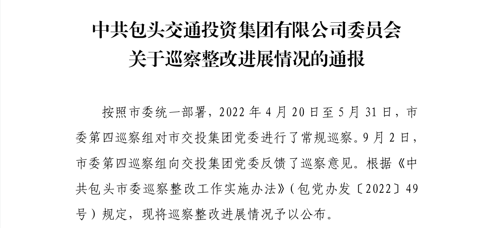 中共包头交通投资集团有限公司委员会关于巡察整改进展情况的通报