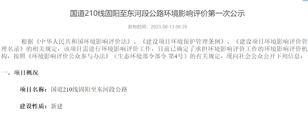 国道210线固阳至东河段公路环境影响评价第一次公示